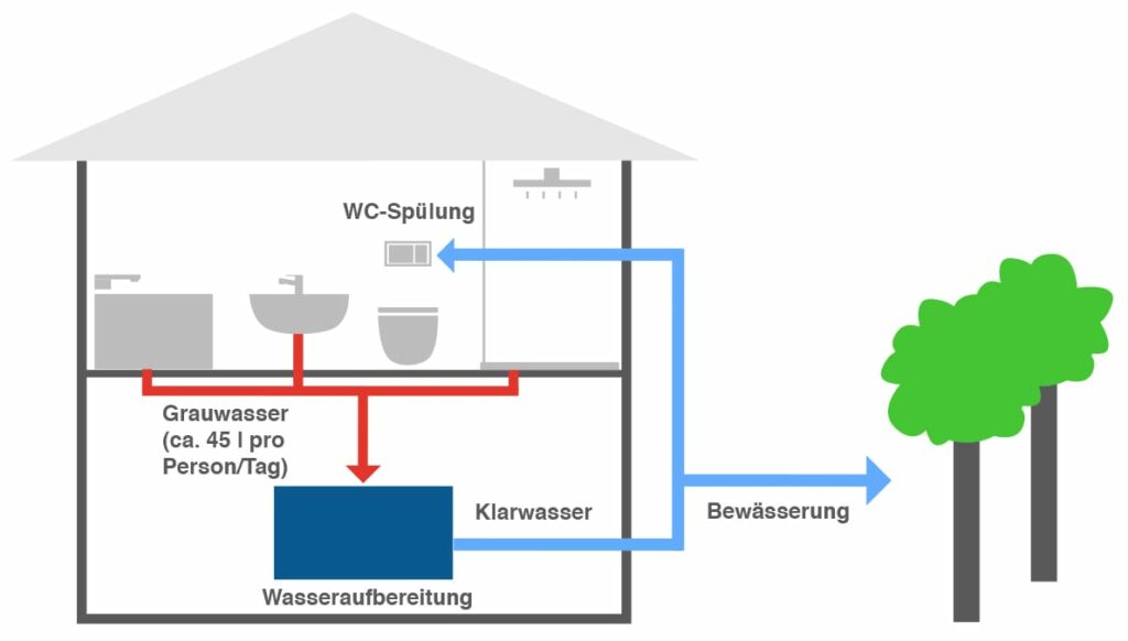 Als Grauwasser bezeichnet man das Trinkwasser, das zum Beispiel beim Duschen, Händewaschen oder in der Spülmaschine anfällt. Über einen Filter wird das Wasser ohne chemische Zusätze gereinigt und kann so für die Toilettenspülung wiederverwendet werden.